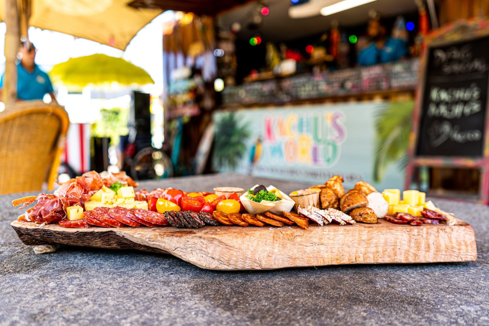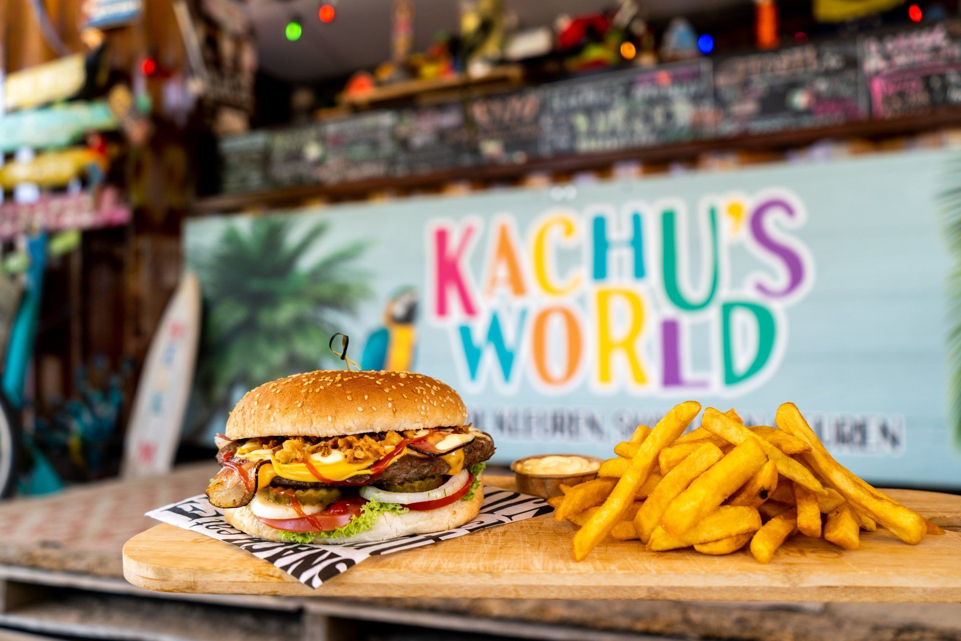 Kachu's World zit op Belcrum Beach maar was niet echt zichtbaar als Kachu's world. Toen ik wat dichter bij kwam zag ik de vrolijkheid ervan af spatten. Het kleurrijke logo, de menukaart die op een krijtbord was uitgeschreven en de hele strandtent beleving als je er stond was gaaf om te ervaren.